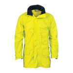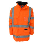 - Fabric: 200D polyester/PVC. Seam-sealed, waterproof outer shell, quilt -lined, concealed hood. Clear ID & phone pockets. "H" Pattern front, "X" back & back tail, Biomotion CSR reflective tape on arms. N.S.W rail compliant.